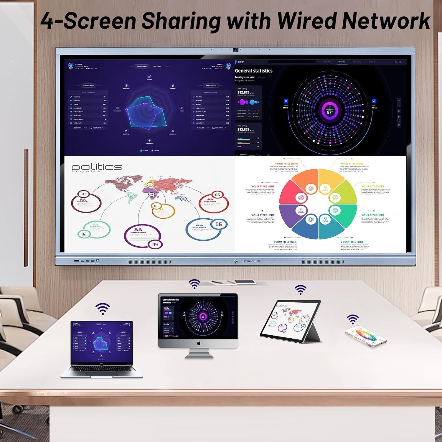 Smart Touchscreen Collaboration-The 65″ 4K smart touchscreen interactive display supports 4-user simultaneous casting via Airplay/Eshare/HDMI. Annotate documents, erase with your hand, and share content via QR code – just like a traditional whiteboard but smarter.