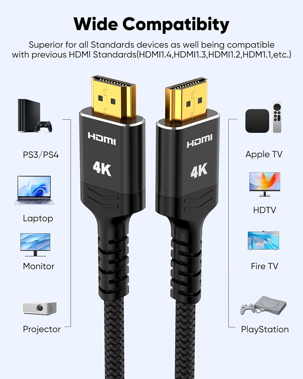 Newest Technology HDMI 2.0 Cable:Highwing’s 4K HDMI Cable meets the latest standard HDMI 2.0 Version,designed perfectly for all devices with HDMI 2.0 standard as well as being backwards compatible with previous HDMI 1.4,1.3,1.2