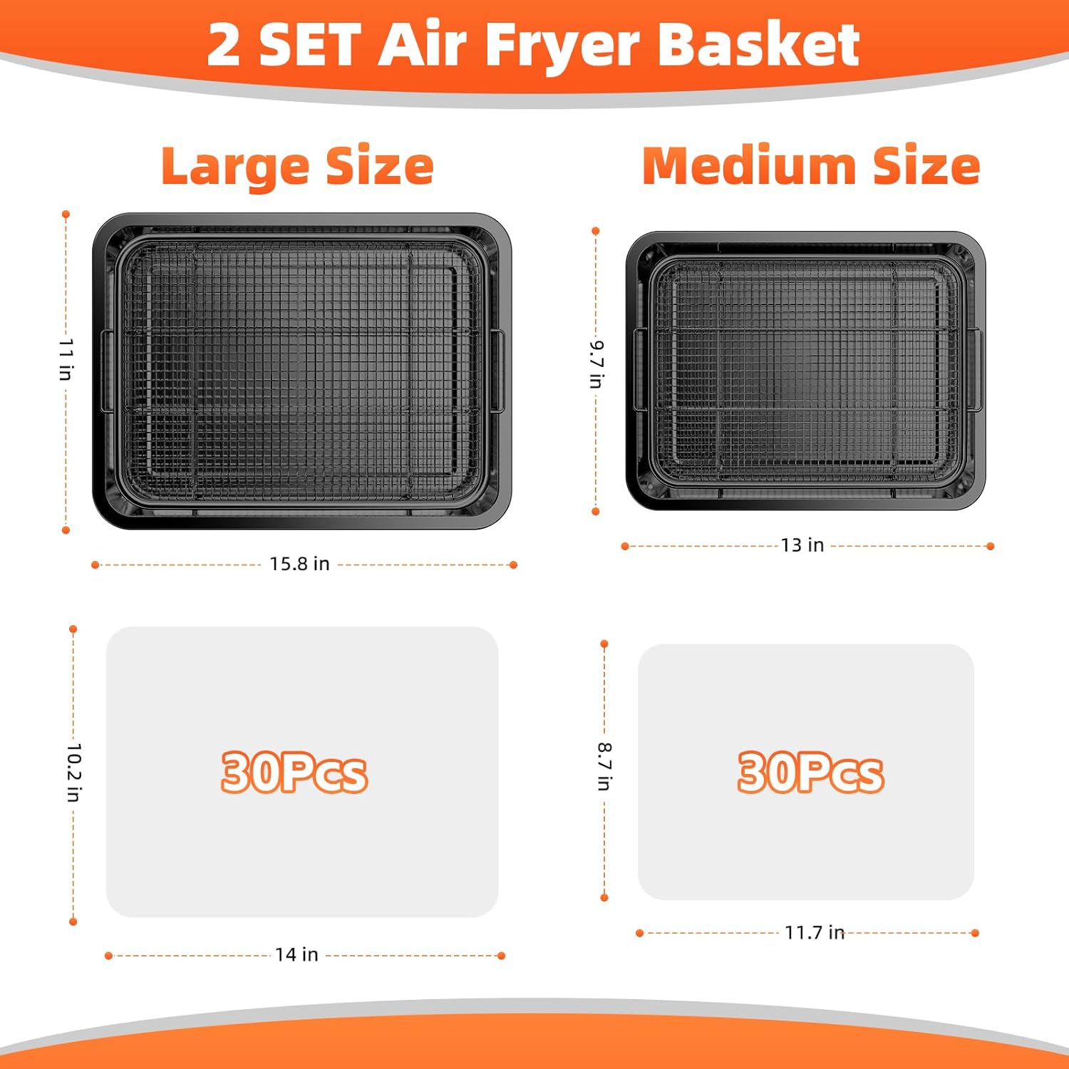 【Great Value 6-piece Set】A price can buy 2-pieces large Air Fryer Basket and Tray Set sized at 15.8×11 inches, 2-pieces Medium Set sized at 13×9.7 inches, and 2 packs of pacherment papers(30 PCS/size), suitable for most home ovens with air frying options and wall ovens.