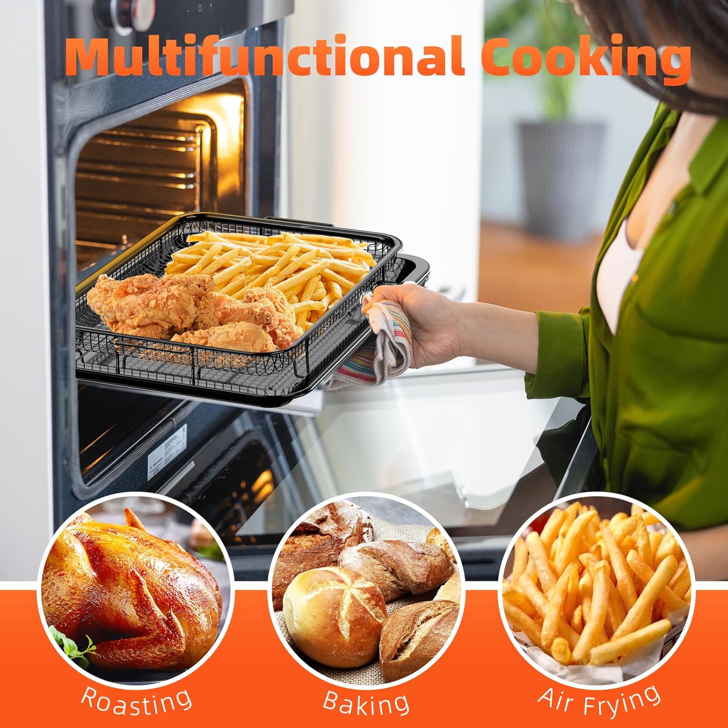 【2 Set for Faster Cooking】2 different size of air fryer tray for oven measuring means you can cook more food at once, saving you time and energy. Whether you’re feeding a family or entertaining guests,this crisper tray and basket set can handle it all.
