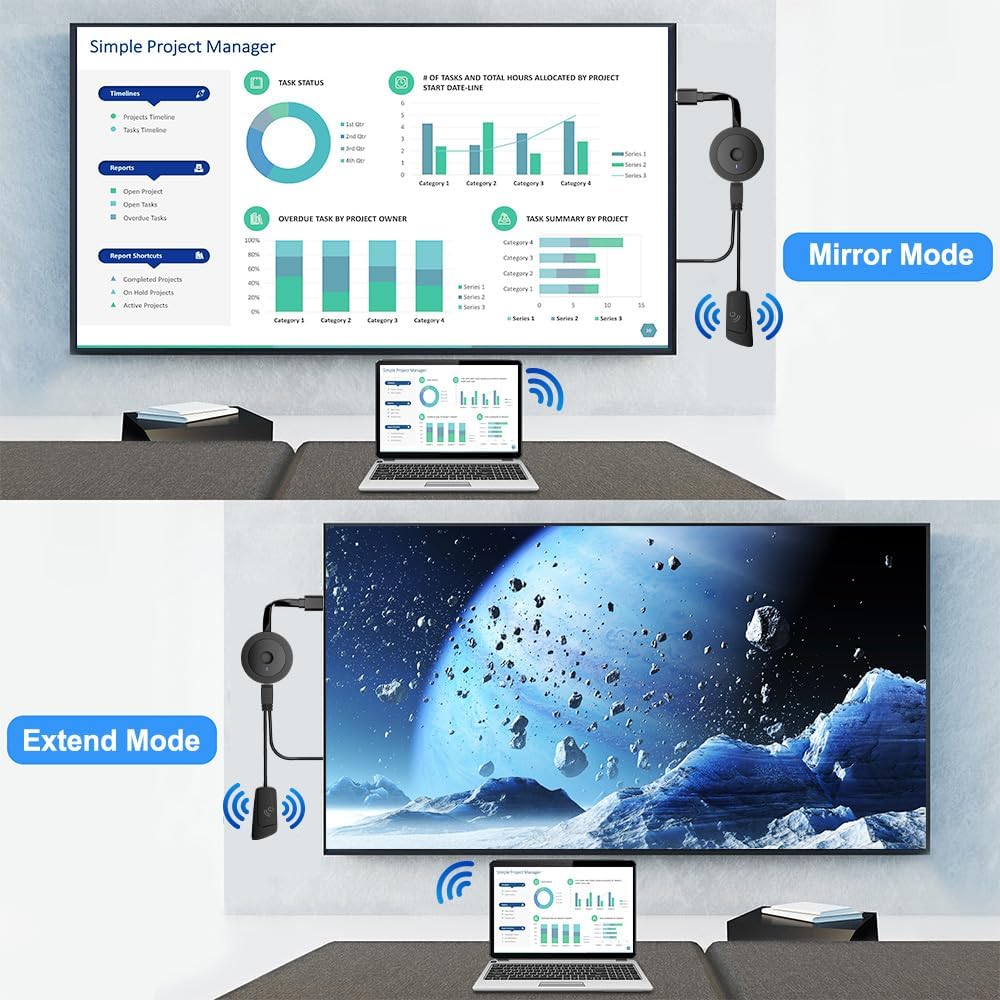【MIRROR & EXTEND DISPLAY MODE】Our Wireless HDMI Dongle features mirror mode and extend mode. Use Extend Mode to share your device’s content on TV in real-time, supporting 4K, 1080P or 720P resolutions. With the mirror mode, you can watch movies on TV while browsing your phone for other websites or apps simultaneously