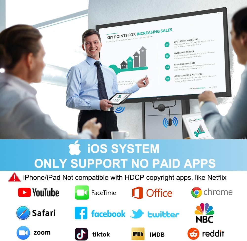 【IOS MIRRORING WITH LIMITED APPS】Using SOCLLLife Wireless HDMI Adapter, you can cast videos, photos, web browsing, and presentations from your i-Phone, i-Pad, or MacBook to your TV. Supports mirroring popular apps like Safari, YouTube, TikTok, Zoom, WhatsApp, and more. Note: Not compatible with HDCP-encrypted apps like Netfix, Prime Video, or Hulu