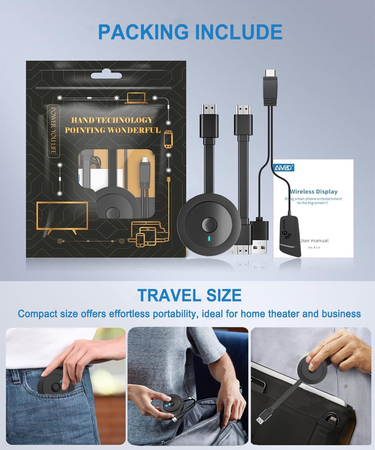 【QUICK SETUP & CONNECTION】No complicated app downloads or Bluetooth pairing required—plug the dongle into your TV, power it, and connect via your device’s mirror function. Truly enjoy HD video and audio with simple, wireless convenience. (Note: iOS users need an extra step to connect to the dongle’s wireless signal)