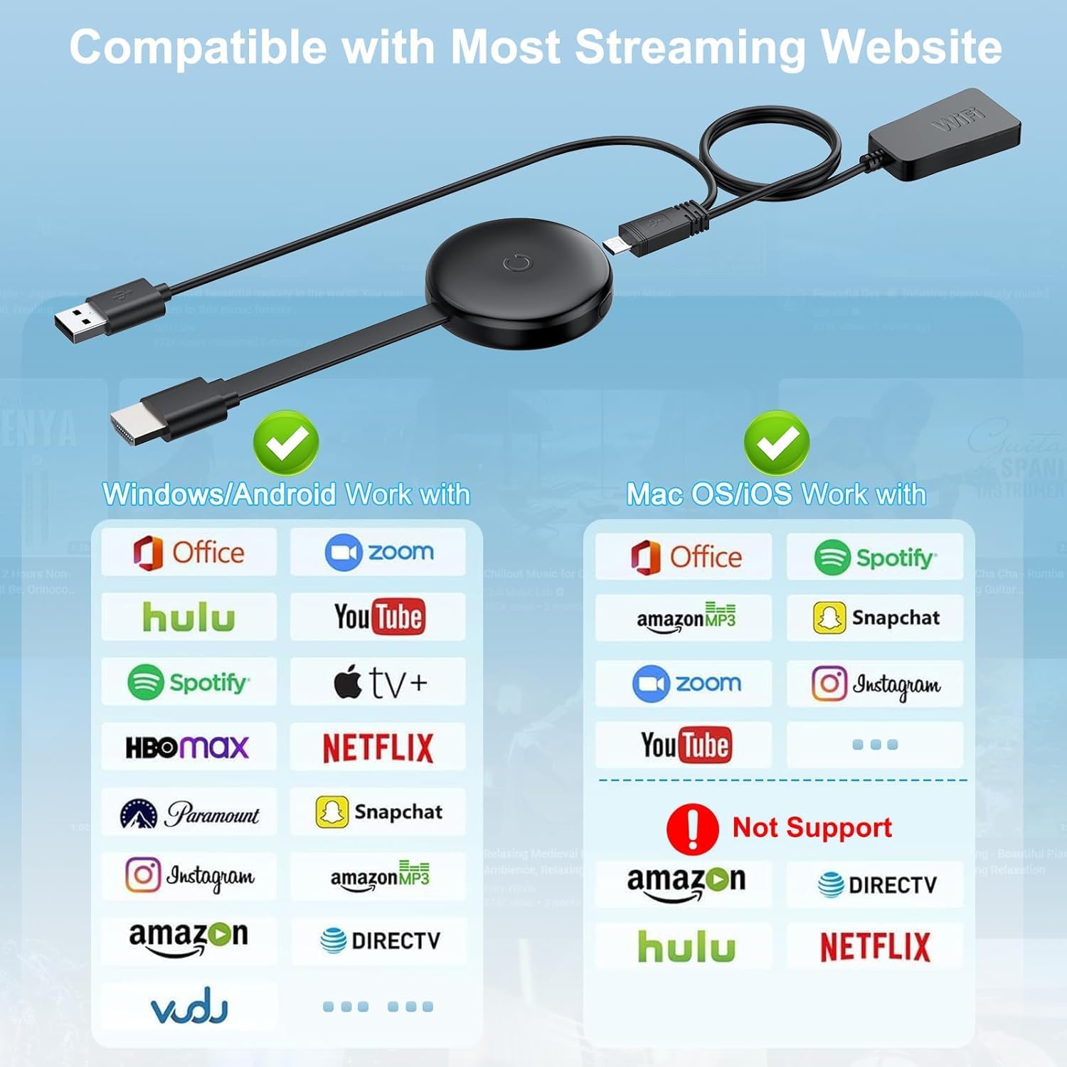 šćWide CompatibilityćWireless hdmi display adapter powerful chipset ensures compatibility with a wide range of HDMI output devices, as well as most smartphones, computers, such as iOS, Android, Windows and macOS devices. Mirror screen adapter support common wireless protocols such as AirPlay, DLNA, Cast and Miracast. Note: hdmi wireless is not compatible with some paid apps that utilize āHDCPā video copyright protection, such as Netflix, Amazon Prime Videos, Hulu, Comcast TV, BT Sport, and more.