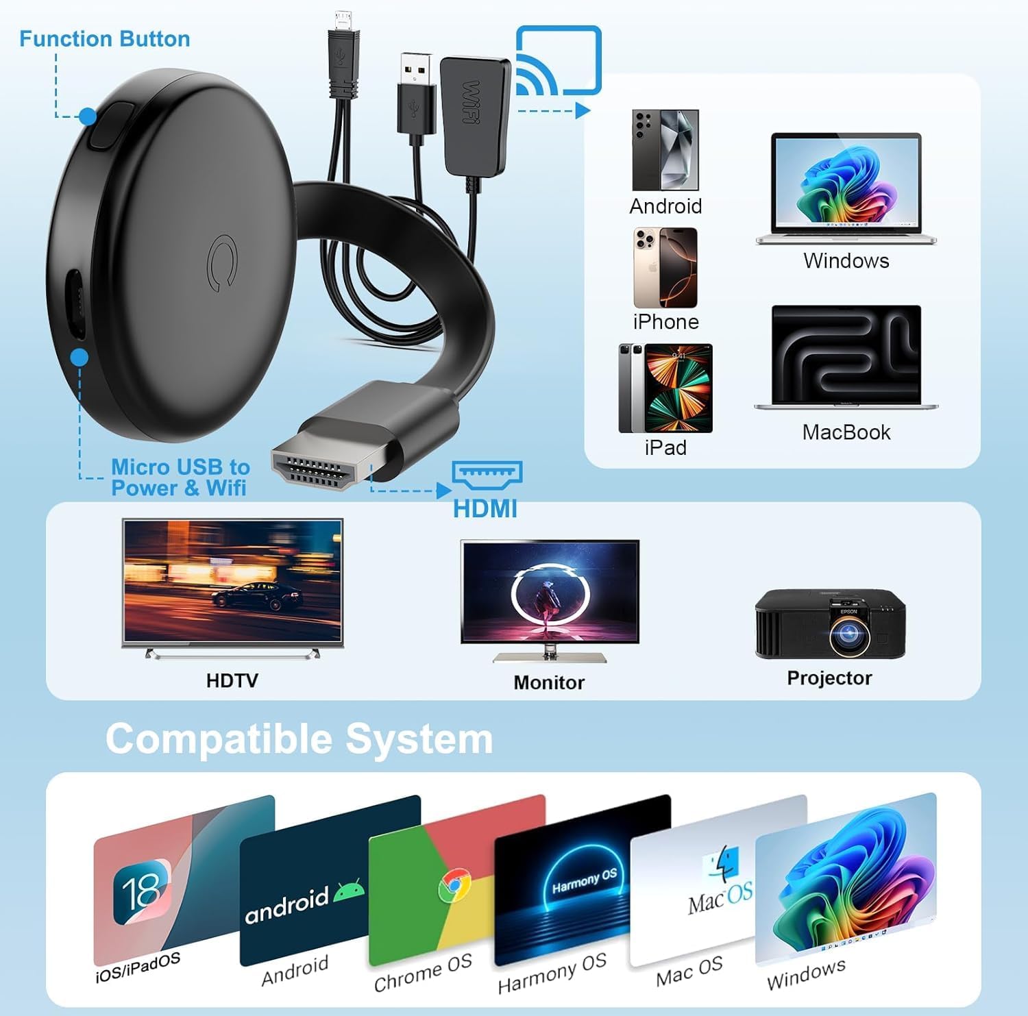 āØćScreen Mirroring and ExtendedćWith Mirroring Mode, simply connect the wireless monitor adapter to your TV, power it on, and enable the Mirroring function on your device to start projecting. Enjoy smooth HD video and audio from your device on any TV. In Extended Mode, the WiFi display dongle turns your TV into a second screen, allowing you to multitask on your device while presenting or watching content. Perfect for presentations, streaming shows, or working while browsing.