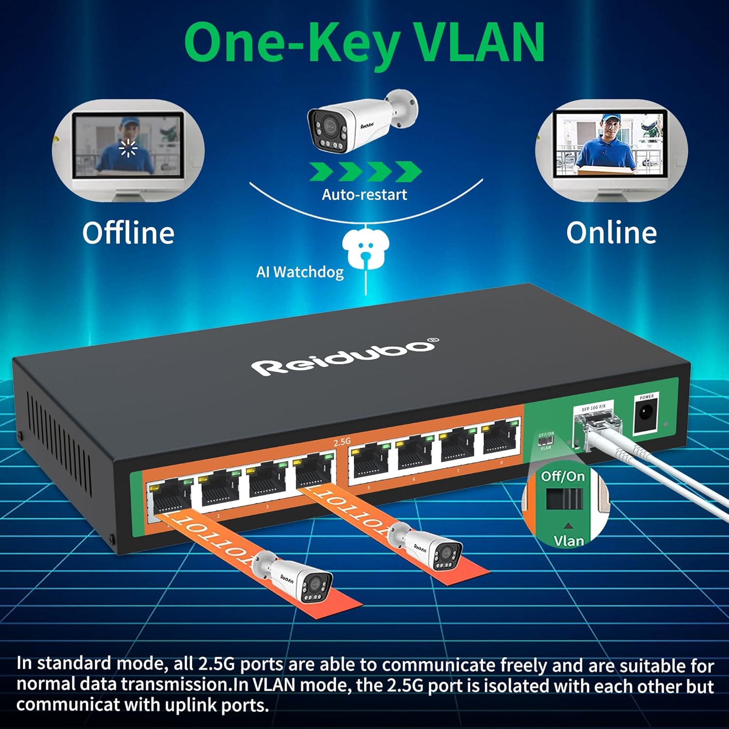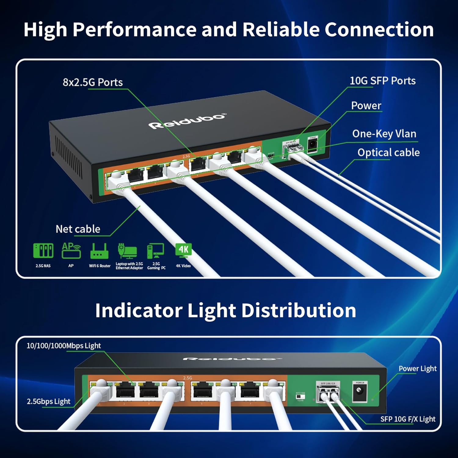 【9 Port 2.5G Ethernet Switch】Reidubo 2.5G switch equipped with 8 x 2.5G RJ45 ports and 1 x 10G SFP. It provides 60Gbps full duplex backplane capacity. All ports support wire-speed forwarding for your devices and allowing you to easily upgrade your network.