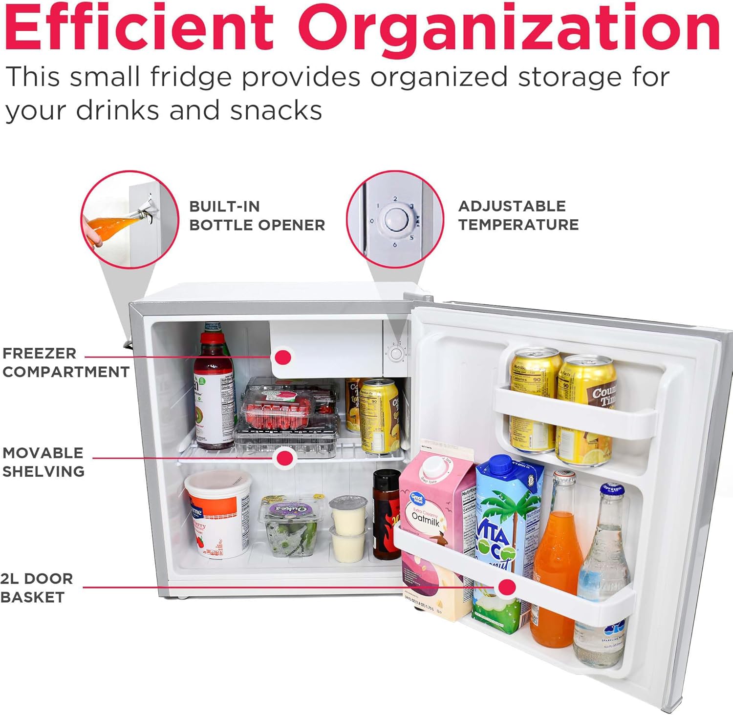 ORGANIZED STORAGE: Equipped with a wire shelf and 2L door basket for large bottles, this mini fridge provides ample storage for your drinks and snacks, along with a chiller compartment and ice cube tray, so you have everything you need, all in one space.