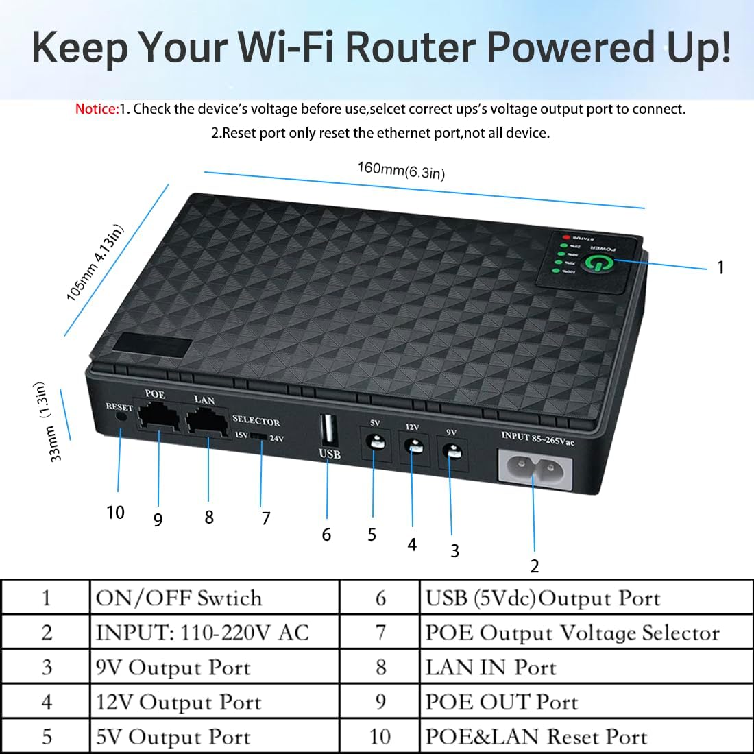 Must know things:1. This UPS only works on devices with specific voltage, please check the power specification of your device before use, and please select the corresponding mini ups output port for connection.2. This UPS supports POE port, the correct way to use POE port: POE port is connected to the device, not connected to the network port.Q). What is included in the box?