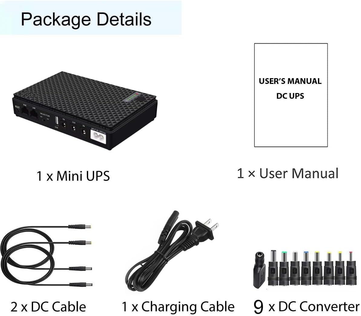A).Box Includes 1 Mini UPS,9 DC Convertert,2 DC cable,1 Charging Cable,User Manual