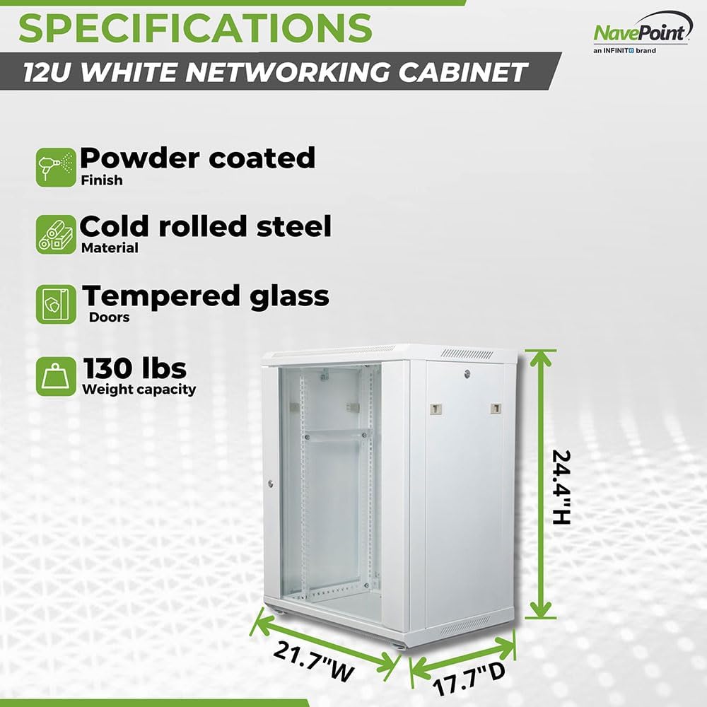 TECHNICAL SPECS – Crafted from cold-rolled 1.2mm steel with welded frames and finished in a sleek white, the NavePoint 12U server cabinet measures 24.4″H x 21.7″W x 17.7″D. Designed for 19-inch standard equipment with a weight capacity of 130 lbs and a max rail depth of 11.75″.