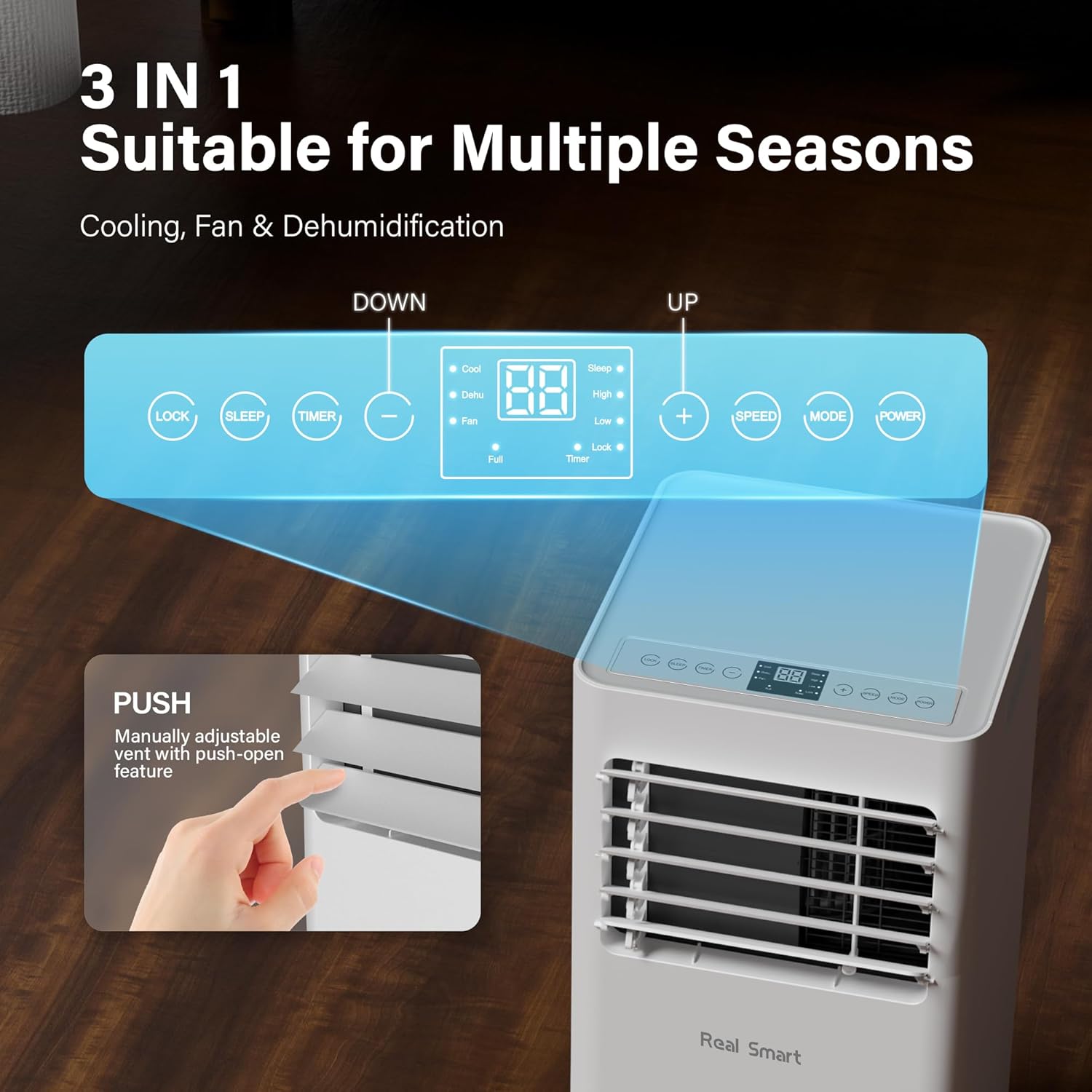 Cooling/Dehumidifying/Fan Function: Smart standing portable ac unit has 3-in-1 function of cooling,fan, Dehumidifier,whether battling humidity or circulating fresh air. Switch between cooling (63°F-86°F), fan (high/low speed), and dehumidifier modes (requires hose attachment)