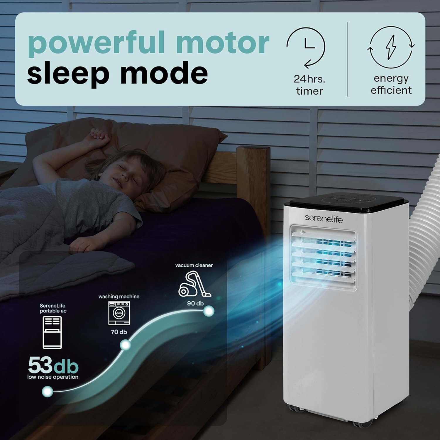 Introducing the SereneLife Portable Air Conditioner 8000 BTU, a compact and efficient free standing A/C unit designed to provide powerful cooling, heating, dehumidifying, and fan modes for spaces up to 300 square feet. This lightweight and portable A/C unit features a rotary compressor and a metal control box to ensure safety by preventing fire and explosions. Equipped with universal castors and rolling wheels, it allows for easy movement and hassle-free setup. The SereneLife air conditioner includes a sensitive touch control panel, automatic upward swing for wide-area cooling, and adjustable time, temperature, and fan speed settings for personalized comfort. This energy-efficient unit has a low noise level motor, operating at just 53 dBA, making it ideal for home, office, school, and business rooms. The modern style, matte body housing adds a sleek look to any room. It comes with a universal window mount AC exhaust kit, a removable and washable air filter screen, and a convenient plug-in operation. The SereneLife Portable Air Conditioner also includes an exhaust hose, window installation plate, remote control, hose connector, and drain pipe in the box. With a power output of 880W, it uses R32 refrigerant and offers cooling capacities of 8000 BTU (ASHRAE) and 5000 BTU (DOE). It has three fan speed settings (low, middle, high), an adjustable timer up to 24 hours, and a moisture removal capacity of 0.9 liters per hour. Constructed from high-quality ABS material, this unit weighs 40 lbs and measures 13ā x 11ā x 27.5ā inches. The included remote control operates on two AAA batteries (included) with a power cable length of 5.9 ft.