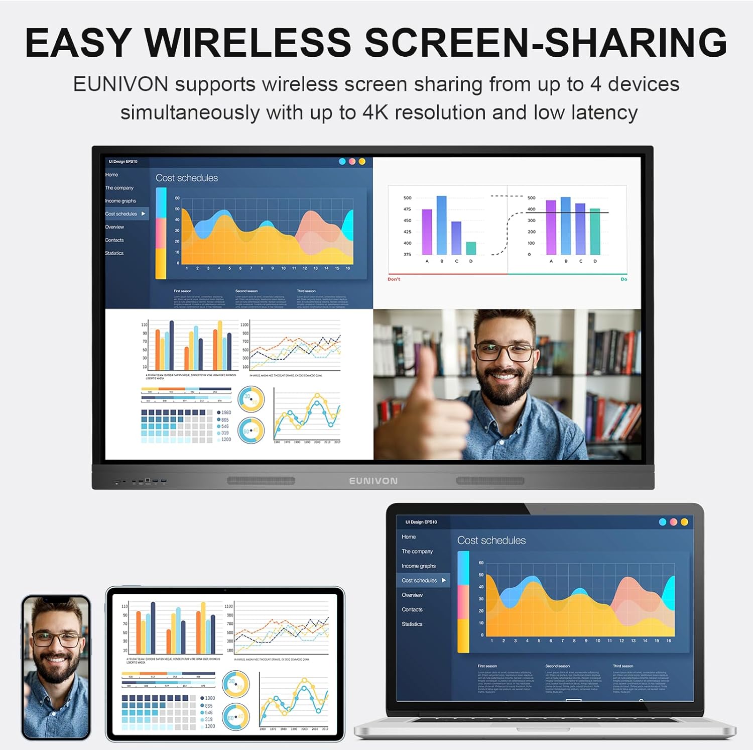 Present and Annotate: EUNIVON smartboard interactive whiteboard allows you to screencast any Mac/Windows/iOS/Android devices, or connect via HDMI. You can annotate on smart boards for classroom or meeting room as needed, share via video conferencing, or pin screenshots on 4k ultra high-definition screen of this digital whiteboard.