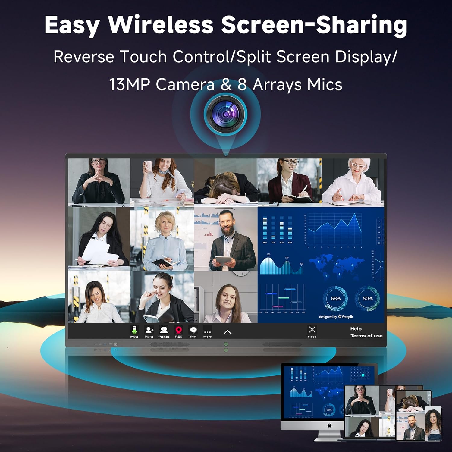 【Seamless Information Sharing】: Digital Presentation Electronic Smart WhiteBoard facilitate seamless information sharing by allowing users to wirelessly connect their devices to the board, share content, and collaborate in real-time, enhancing productivity and communication. smart board supports up to 4 users to Wireless screen projection, or by connecting in ports.