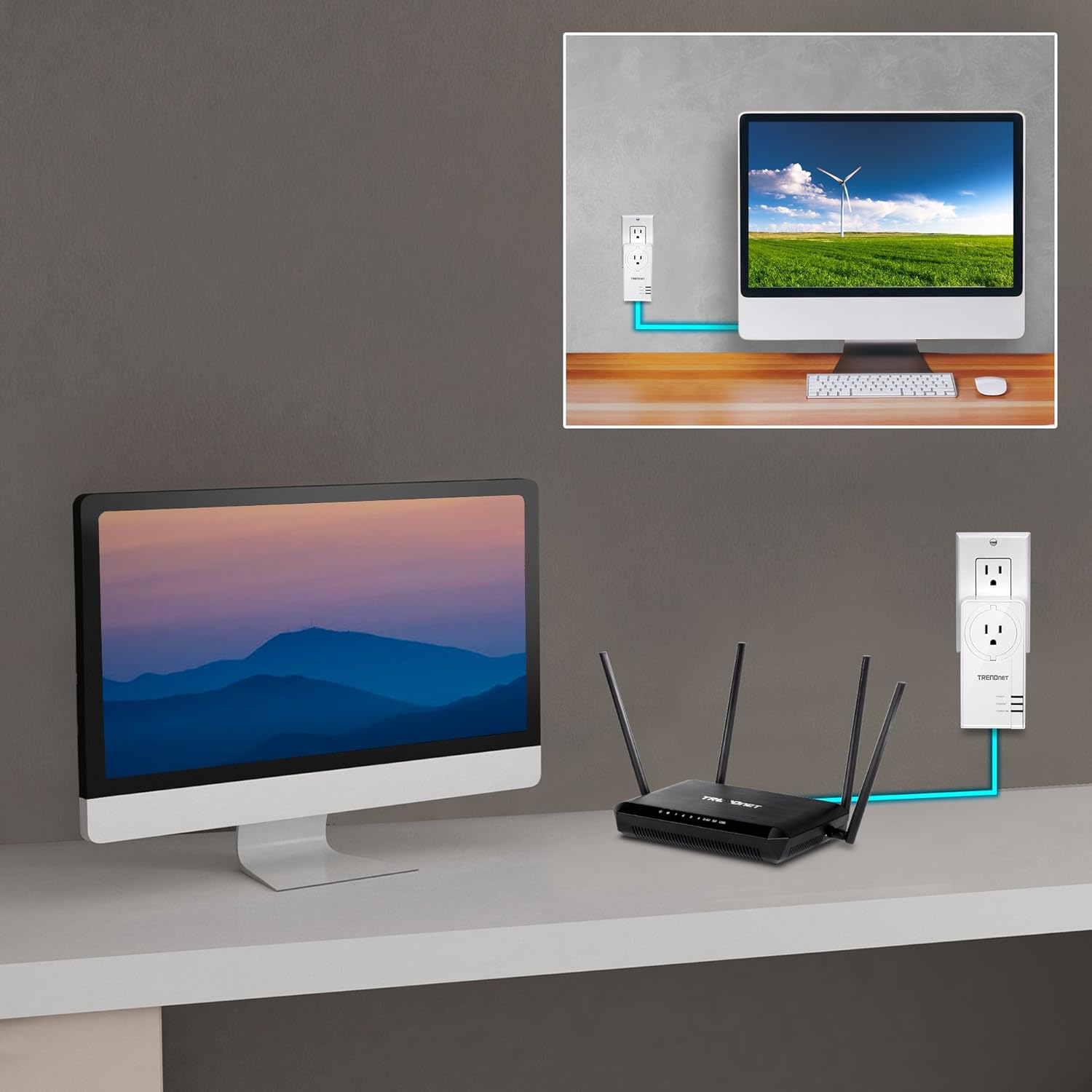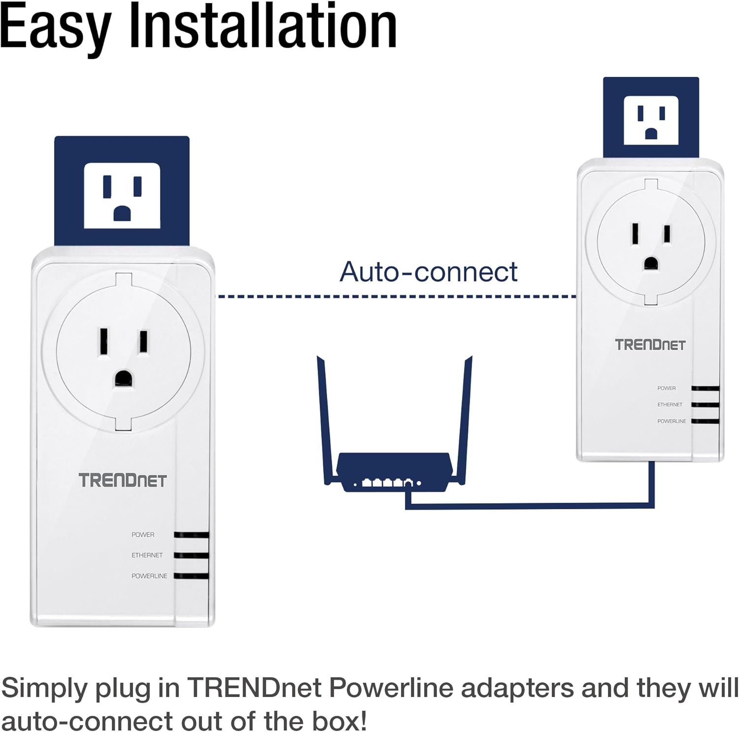 TRENDnet’s Powerline 1300 AV2 Adapter with Built-in Outlet, model TPL-423E, creates a high-speed Powerline 1300 network using your home’s existing electrical system. Two adapters are needed to start a network. TRENDnet adapters are protected with 128-bit AES encryption. Plug in the first adapter and network it to your existing router. Plug in other adapters on the same electrical system and they will auto-connect to the first adapter for instant internet access. Avoid losing a power outlet by using the built-in electrical outlet to power other devices.